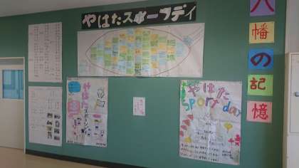 朝から気持ちのいい青空が広がりました。やはたスポーツデイの記憶がだんだん遠ざかり、学校に日常が戻ってきました。でも6年生は振り返って、本当に歴史の1ページにしようとしています。体育館にむかう途中の掲示板に6年生がまとめをしています。まだ完成ではないようですが、その大きさに驚きました。