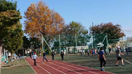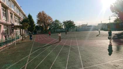 昼休み、ゆりのきの葉が校庭にたくさん落ちています。子どもたちは元気に遊んでいました。