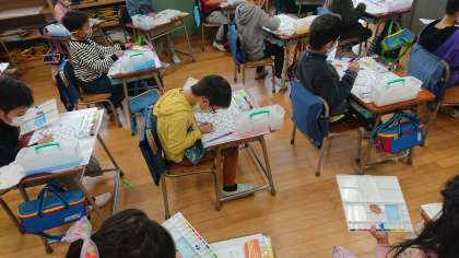1年生の図工の時間、絵の具の使い方を習っていました。2色を混ぜて新しい色を作るやり方を先生から聞くと、さっそくやってみた子どもたちです。自分の思い描いた色が作られると、うれしそうな表情になりました。想像以上に気に入った色ができると、周りの子に「見て見て」と働きかけていました。