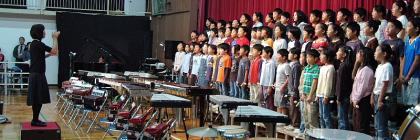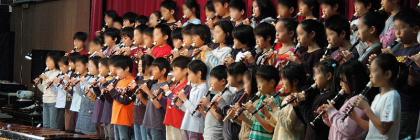 休憩をはさんで後半のトップは4年生の合唱「牛飼いのヨーデル」とリコーダー合奏「オーラ・リー」。観客席で多くの保護者・家族の皆さんが見守る中で、4年生ならではの美しい高音の歌声と、リコーダーのハーモニーを聞かせてくれました。