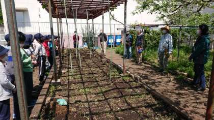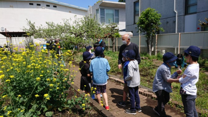 ちょうど、4年生が虫探しの学習にきて、そこでいろいろなことを教えてもらうことができました。YMOAは10年以上、八幡小学校のためにご協力をいただいている方々です。4年生と対面で自己紹介いただきました。