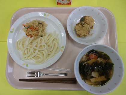 よもぎ(青森県産)を使った草団子は季節感のある一品となりました。低中学年は一人2個、その他は3個です。麺の量の調整ができないので、つけ麺にして食べました