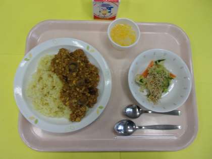 「ちりめんじゃこ」を使った「じゃこサラダ」はカレーライスによくあいます。清涼感のある「カルピスゼリー」と組み合わせました。