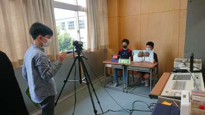 給食時間、感染症予防のため、子どもたちはおしゃべりをせず黙々と食事しています。その時間で、ホッとするのは放送委員会にるお昼の放送なのですが、今日はテレビ放送がありました。先生の指導のもと、担当児童が、カメラマンやアナウンサーを務めて番組を提供しています。
