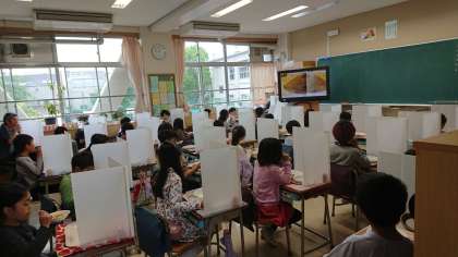 教室では、パーティションの間から、時折テレビ画面を見て、楽しんでいるようでした。以前のように、グループで顔を見ながら食事することができるようになるのは、いつなのか、まだまだ難しい状況です。