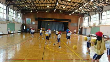 5年生の体育の時間です。ボールを使った運動に取り組んでいます。背中側に持ってボールを上に投げてお腹側で取る、次にその逆をやってみるということで、それぞれに挑戦していました。