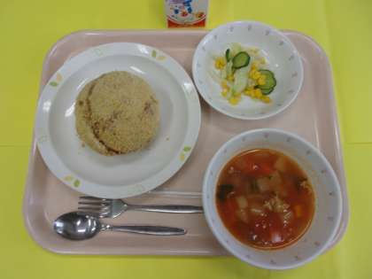 丸パンにキーマカレーを挟んで、どろ(小麦粉+カレー粉+水)にくぐらせて、パン粉をまぶして、スチームオーブンで焼きました。おいしいカレーパンが焼き上がりました。