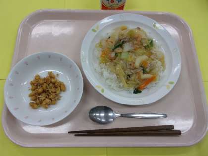 今日から10日まで「歯と口の健康週間」です。かみかみメニューの「大豆とじゃこの甘辛揚げ」を用意しました。人気メニューでもあります。噛むことの効果を考えました。