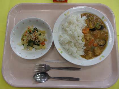 夏野菜のなす、さやいんげん、トマトを使ったカレーライスです。いつもより、甘口に仕上げました。