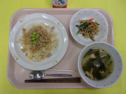 今日の三色丼は、鶏肉(茶色)、炒り卵(黄色)、枝豆(緑色)の三色です。