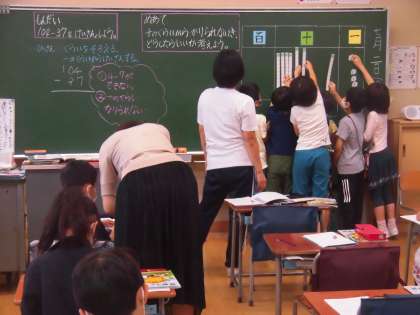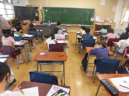2年生の算数の時間です。2回繰り下がりのある引き算の学習をしていました。やや困ったような顔て考えている子たちに、先生から声がかかりました。そして友達と一緒に考え始めました。すぐに答えがでないときに、あきらめず粘り強く考えることが大事です。2年生の子どもたちは、一人でも複数でも、一生懸命考えて学習に取り組んでいました。