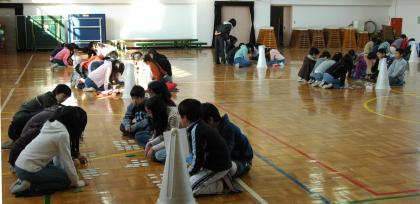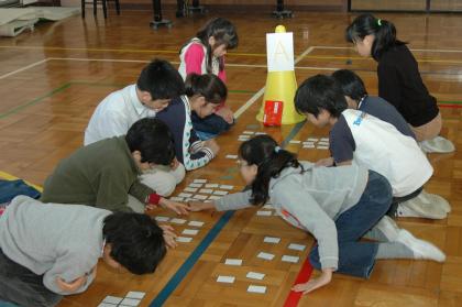 1月10日5・6校時。やわらかな日差しが差し込む午後の体育館で、6年生が百人一首大会を行いました。教科「日本語」で学習したことを生かし、団体戦で楽しみました。