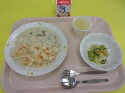 今日は旨味とコクの鶏もも肉をたっぷり使った「チキンクリームライス」です。デザートにはさっぱりとした「りんこゼリー」を用意しました。