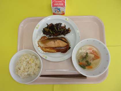 今日は八幡小好きな魚アンケート第一位の「鮭」の献立、「鮭のみそマヨネーズ焼き」です。大麦、あわ、ひえを使った「雑穀ごはん」と組み合わせてみました。