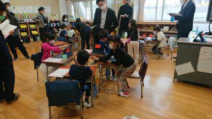 区内のいろいろな学校の先生が参加して、研究授業が行われました。1年生の「みんなの にこにこ大さくせん」です。家族のにこにこを増やすため、どんなことができるか考えて実行した報告会をしました。グループに分かれての報告会では、互いの話を聞きながら自分のことを振りかえっていた子どもたちです。