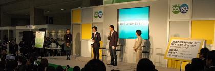 11日、6年生が有明の国際展示場で行われた「エコプロダクツ2008」を見学しました。この催しは、エコ活動に取り組んでいる協賛企業や機関、大学、NPO法人等がブースを出展し、それぞれの取組みをプレゼンテーションしたり宣伝したりする大規模なイベントです。本校は昨年から見学しています。協賛企業の資金提供で、往復の貸し切りバスは無料でした。会場の駐車場は集まったバスでいっぱい。とても多くの幼稚園生から高校生まで、幅広い児童生徒が見学に訪れていました。会場に入り、広い会場をグループごとに見学。それぞれのブースではアンケートに答えると記念品がもらえるところが多く、資料とともに数多く集めた子もいました。また、著名人が出演するブースなどもありました。(写真) 〜つづく