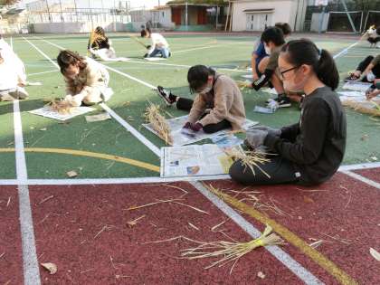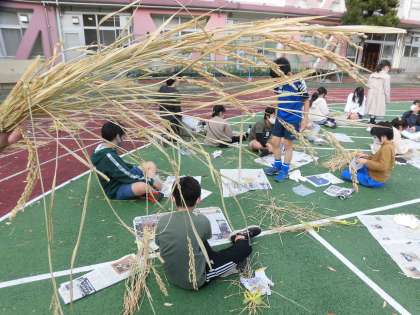 先週川場移動教室に行ってきた5年生ですが、そのとき稲の「はせがけ」について聞いたことを思い出しながら、「八幡田んぼ」の稲の脱穀を行いました。穂についた米をてでとって、袋に入れていきます。手作業なので、なかなか量が増えません。昔の人になったつもりで、みんな頑張って「脱穀」していました。