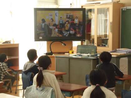 今朝はテレビ放送による音楽朝会がありました。日頃の音楽授業の成果として、6年生の合奏と歌