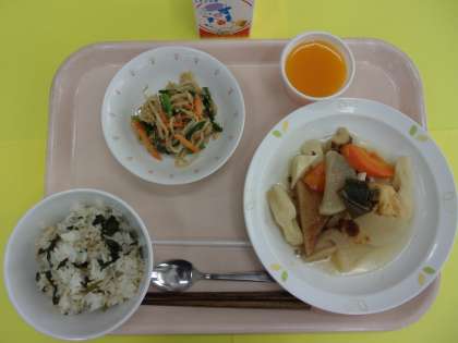 今日は「大根の葉」が八百屋さんになかったので、代わりに「小松菜」を使いました。いりごまとほどよい塩味でおいしい菜めしができました。「おでん」の具材はいろんな形に切ってみましたので、上手に器によそってください。