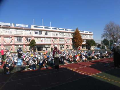 月に一度の避難訓練です。今日は地震のあとに火災が起こったという想定で行いました。火元が給食室なので、防火シャッターが下りたところで、校舎の西側の出口を使って、全校児童が短時間に安全に避難することができるか、ということを確認しました。体育館を経由し外に出るということを行ってみました。静かにできたと思います。