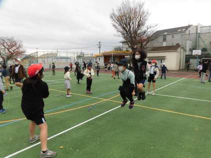 二重とびのコツを教えてもらって、何度も練習している子がいました。「自分もとべなかったときには、すぐにしゃがんでしまっていたんだ」と、上級生に声をかけられて、さらにやる気をもって頑張っています。子ども同士の関わりで、伸びていくのがよくわかります。