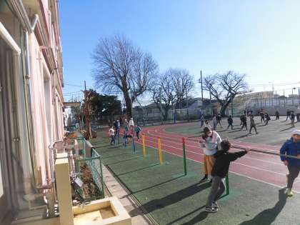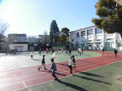 中休み、校庭では子どもたちが元気に遊んでいます。のどかな風景です。