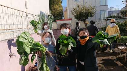 新年最初の八幡ファームでの活動です。YMOAの皆さんと新年のごあいさつをして、ファーム委員会の子どもたちの活動が始まりました。風は冷たいのですが、日が当たっていれば温かく感じます。写真の子どもたちが手にしているのは、大きく育った小松菜です。