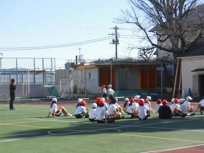日中になると日差しが温かくて、外に出ても気持ちいいです。4年生が体育をしています。先生が、順番を待ちで待機している子どもたちに「こちらに移っていいよ」と日向を指すと、喜んでいました。