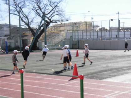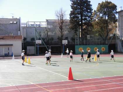 この頃、日差しが春めいてきました。校庭で2年生が「たまごサッカー」をしています。