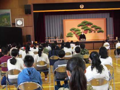 体育館のステージが老松の描かれた張り出し舞台となりました。開演を待つ十数分、2校の6年生たちの心を静めて期待を募らせてじっと待っている姿に、最高学年としての成長を感じました。