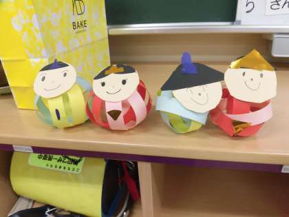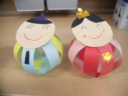 図書室司書の先生が、ペープサートで、ひな祭りの由来について話してくださいました。ひしもちの色、ひなあられの色は子どもの成長や季節に関係していることを知った子どもたちです。そのあとみんなで手まりびなを作りました。どことなくだれかの顔に似た、かわいらしい人形です。みんなの健康を見守ってくれることでしょう。