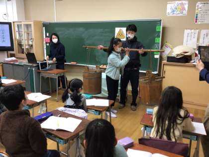 今と昔の奥沢や田園調布などの様子を見比べて、地域の様子の移り変わりを学びました。後半には、大正時代に農家の人が使用していた「下肥」を実際に持たせてもらいました。およそ10kgあるその重さから農家の人の大変さがわかった子どもたちです。