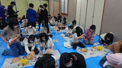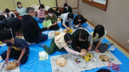 ふくべ細工が始まりました。栃木県のかんぴょうは有名ですが、ふくべとはかんぴょうやうりの実を乾燥させたものということです。お面のような形や花の柄など、くりぬいてもらった後に絵の具で描いて作ります。子どもたちが描いたものにニスを塗ってもらって完成です。後で学校に送ってもらいます。