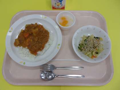 今日から一年生の給食が始まりました。みなさんの大好きな「カレーライス」です。 しっかりと食べて大きくなってください。
