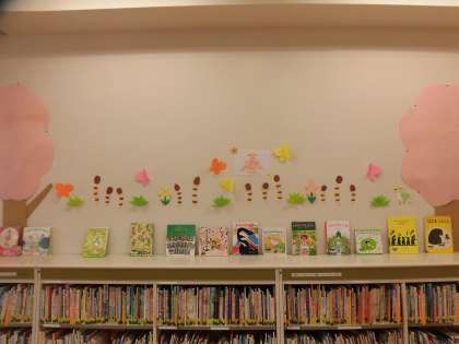 図書館には、本を手にとって読みたくなるような春らしい掲示物が飾られていました。クラスごとの図書館利用も始まっています。