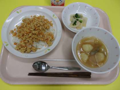 今日の芋だんご汁のだんごは一人2〜3個です。上手に大椀によそってください。高野豆腐は凍り豆腐ともいわれ、豆腐を凍結、乾燥させたもの