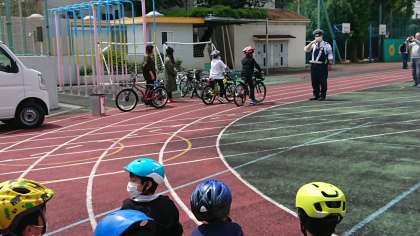 3年生の自転車安全教室には、お母さんやお父さんが自転車を持って来てくださり、実際に乗って安全確認をしました。