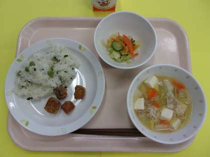 グリーンピースは鹿児島県産です。グリーンピースも鰹も旬の食材です。旬のものは栄養価が高く、安価です。八幡小学校の給食は「旬」を大切に考えます。