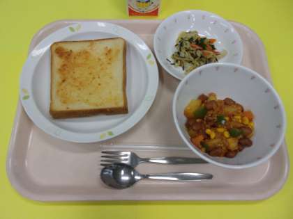 「チリコンカン」は赤えんどう豆を下ゆでして、肉や野菜と一緒に煮込んだ料理です。香りづけにチリパウダー、バジル粉を使いました。