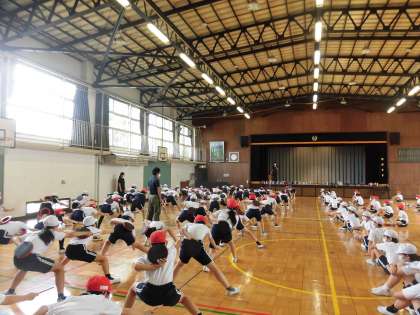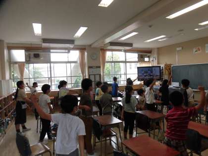 朝の時間、運動会の全校で行うはじめの運動を各教室で練習しました。これは委員会の子どもたちが振付を考えたもので、テレビ放送を使って見せて覚えてもらおうというものです。それぞれの教室に委員会の子どもたちが、取り組みの様子を見守りにいっています。