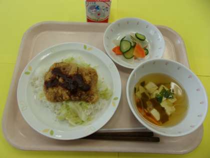 愛知県の八丁みそを使った「みそだれ」を豚カツにかけて、キャベツと一緒にごはんの上にのせ、「味噌カツ丼」にしました。