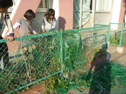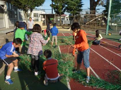 八幡グリーンサポーターや飼育委員会、4年生等を中心に育ててきた「緑のカーテン」は、その役割を終え、4年の児童が取り外しました。茎の長さは8mを超えるものもありました。網ははそのままビニール袋で保存しました。また来年の夏まで一休み。