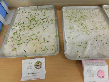 さて、写真は1年生の教室で見つけたほんとに小さな芽生えです。担任の先生が細かな種をこのように水に浸した綿の上にまき、育てています。今度はもう少し大きな器に移植するのです。これから大事に大事に育てていくということです。