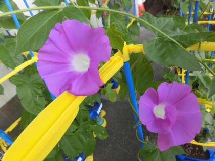 1年生の鉢植えのアサガオが大きな花を咲かせています。ほんとうにきれいですね。植物の生長と子どもたちの成長が重なって、どちらにも「大きく育ってね」と思わずにはいられません。