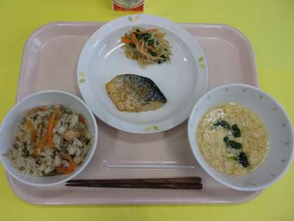 ノルウェーでとれた「さば」を使った七味焼きです。油がのった魚です。磯おこわと組み合わせてみました。かきたま汁に使った青菜は「ほうれん草」、おひたしの青菜は「小松菜」です。食べ比べてみましょう。