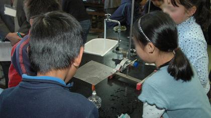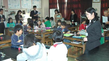 つづき〜 写真は本校4年生2組の授業の様子(上2枚)と研究協議会の様子です。授業は理科室で行い、「もののあたたまりかた」を学習しました。ロウを塗った金属板をアルコールランプで熱し、ロウが融ける様子を観察して熱の伝わり方を学習する内容でした。火を扱うため、子どもたちは緊張気味でしたが、ロウが同心円状に融けていく様子を見て感動していました。その後会議室に会場を移し、研究協議会で授業についての活発な意見の交換をしました。