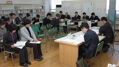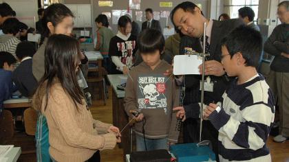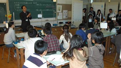 つづき〜 写真は5年1組の授業の様子(上2枚)と研究協議会の様子です。授業は家庭科室で「振り子の運動」を行いました。鉄球の振り子を60センチの糸につるし、ふれ幅を変えて10往復の時間を測る実験でした。測定を正確にすること、出てきたデータをどう解釈するかがポイントの授業です。どのグループも、振り子によく注目して、かなり正確に測ることができていました。図書室で行われた協議会ではデータの読み取りについて活発な意見交換が行われました。