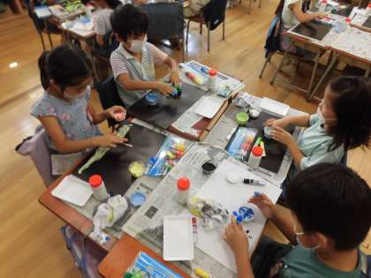1年生が「気持ちいいよ」ときれいな色ができたのを見せてくれました。図工の時間「さわってかくの きもちいい!」という学習です。カップの中で白い絵の具とほかの色の絵の具を混ぜて、思い思いに新しい色を作っています。それを使って、黒い紙や白い紙に指で描いています。楽しそうに活動していました。