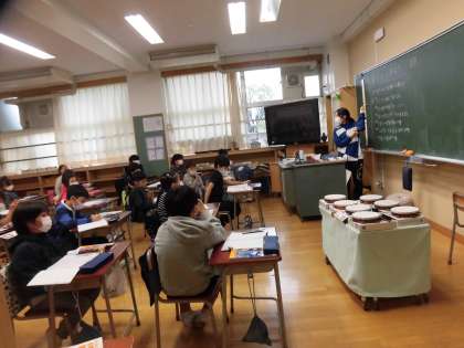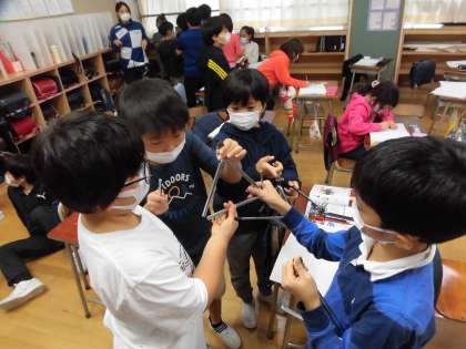 3年生の理科の時間。音を聞く活動をしています。音楽の時間に使うおなじみの打楽器が実験材料となります。どんなふうに響いているのか、鳴らして感じている様子です。同じ楽器でも、鳴らし方が違うとずいぶん違った音になることに気づいて、ぱっと表情が変わりました。