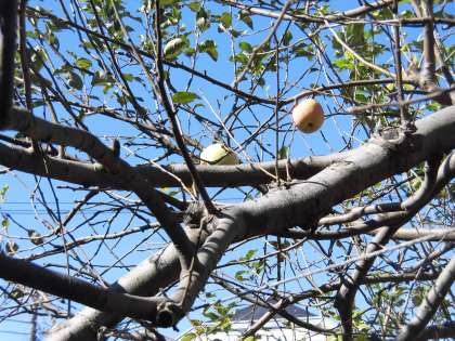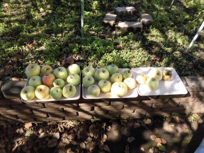 例年になくよく実りました。このリンゴは来週、給食の食材となってみんなで味わうことにしたいと思います。品種はふじです。生で食べるにはすこし青くで数が足りません。どんなものに変身して給食に出されるでしょうか。